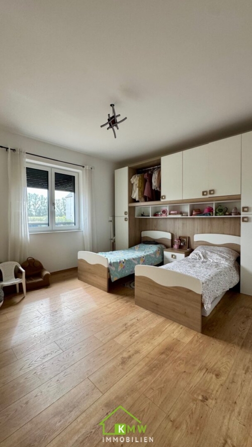 Die großzügige Geschossfläche teilt sich in – Vorraum mit Garderobe, Wohn- Essbereich mit offener Küche und integrierter Speis, 3 Schlafzimmer, Schrankraum, Bad mit Badewanne, Dusche und WC, Hauswirtschaftsraum und ein Gäste WC.