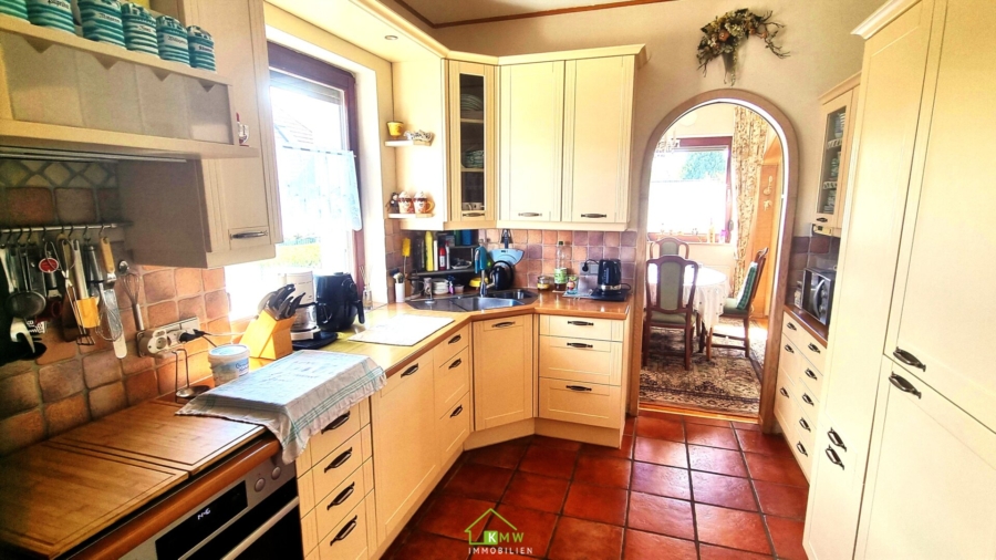 Die moderne Einbauküche lädt zum gemeinsamen Kochen und Genießen ein und grenzt direkt an den großzügigen Wohnbereich mit Zugang zur überdachten Terrasse (ca. 40 m²). Hier können Sie entspannte Stunden im Freien verbringen, während der gepflegte Garten zusätzlichen Platz für Erholung, Spiel und Freizeitaktivitäten bietet. Die Garage rundet das Angebot ab und schützt Ihre Fahrzeuge zuverlässig vor Witterungseinflüssen.