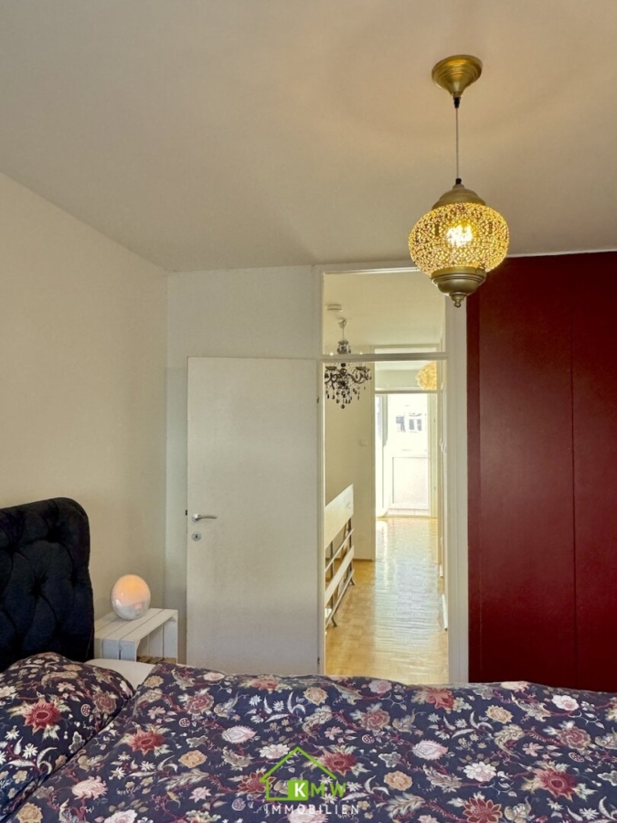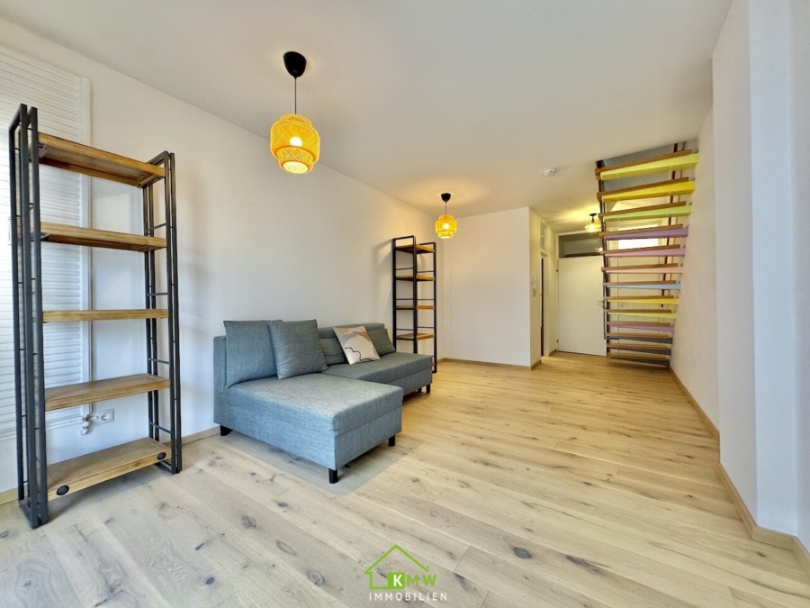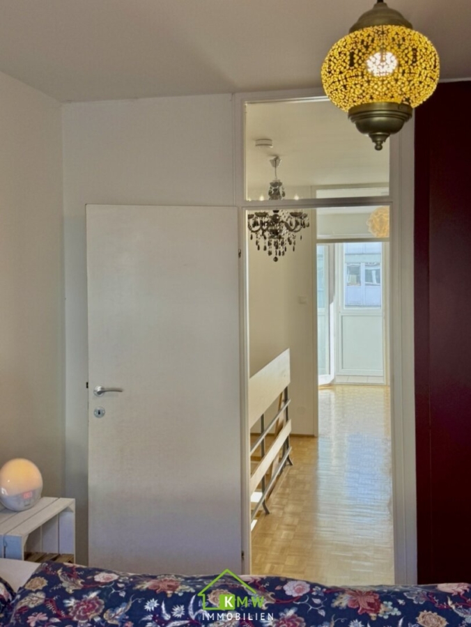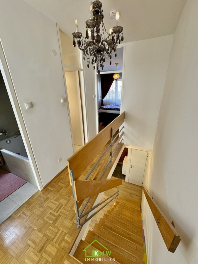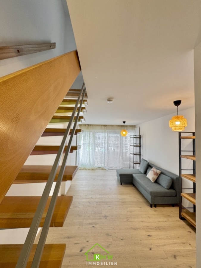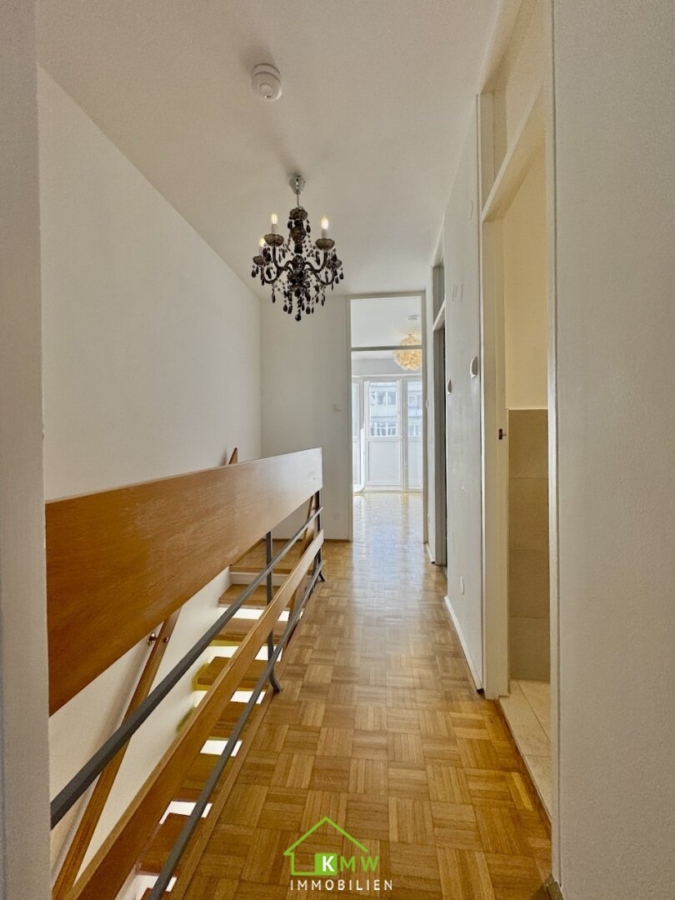 Die Wohnfläche von rund 76 m² verteilt sich auf 2 Ebenen. Auf Ebene 1 befinden sich Vorraum, Abstellraum, Küche sowie Wohnzimmer mit Ausgang auf die Loggia. Über die Treppe erreichen Sie das Obergeschoß mit 2 Zimmer Bad mit Wanne und separates WC.